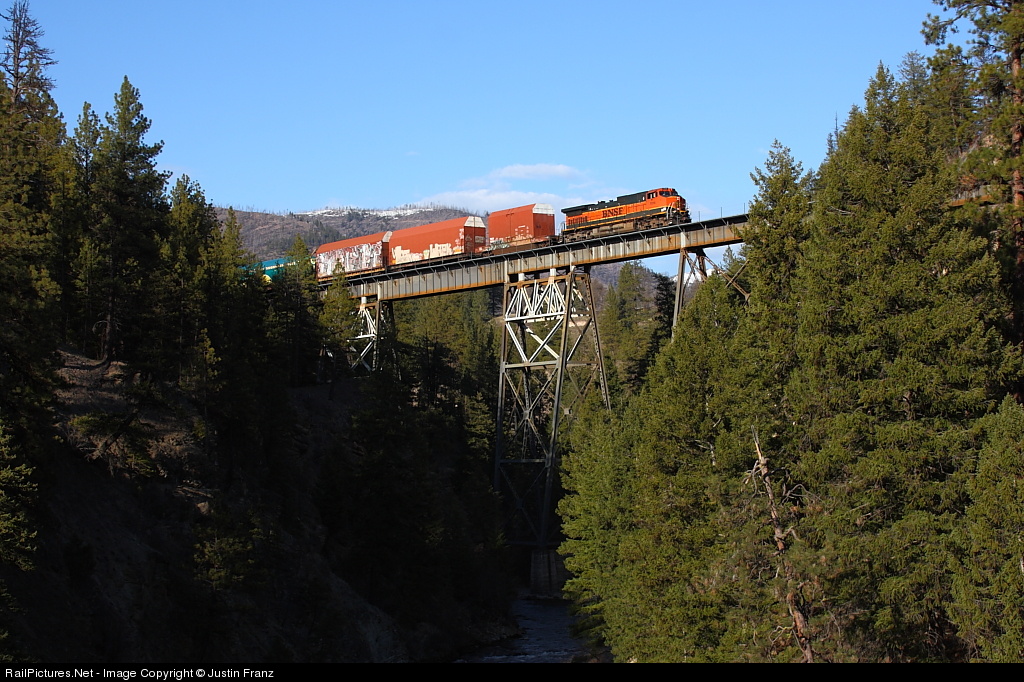 BNSF 1014 leads J-WICINB9-19A across Fish Creek Trestle on Montana Rail Link's 4th Subdivision, just west of Cyr, Montana, on April 23, 2011. Behind the locomotive is a short train consisting of Boeing aircraft parts and fuselages heading for the Pacific Northwest.