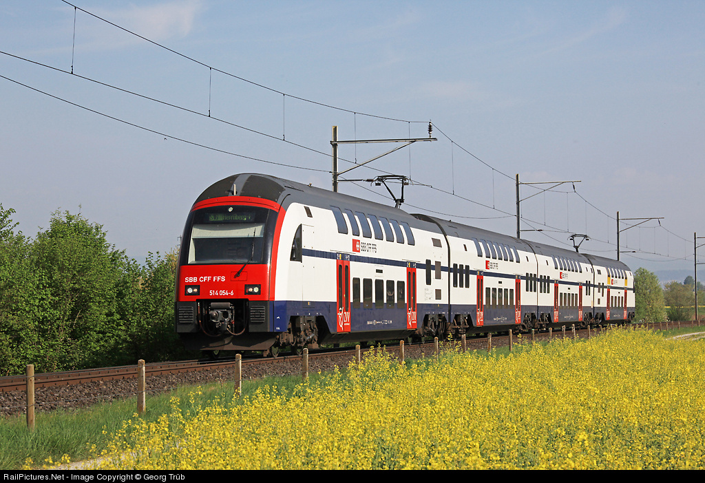 | Doubledeck commuter trainset (61 trains built by Siemens 2005-2009) RABe 514 054 as "S 16" service from Thayngen via Schaffhausen-Winterthur-Zürich to Herrliberg-Feldmeilen, passing a rape field near Henggart. |