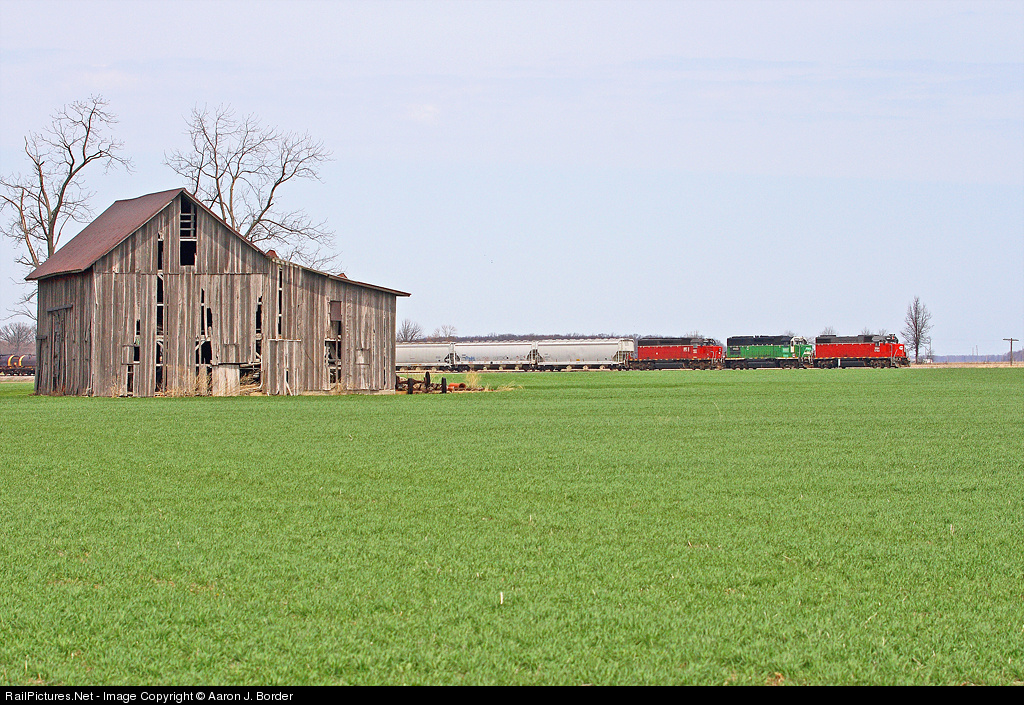 A motley assortment of RailAmerica EMD power leads a short southbound just north of Leipsic. The Lima-Delta turn job died at Delta earlier in the morning, and was recrewed by the Lima-Springfield turn crew, allowing for a rare daylight southbound on this stretch of the old DT&I. Power was CF&E 3884 (GP38-2, ex-CNW), CBNS 5007 (GP50, ex-BN), and IORY 4083 (SD40-2, ex-CP).