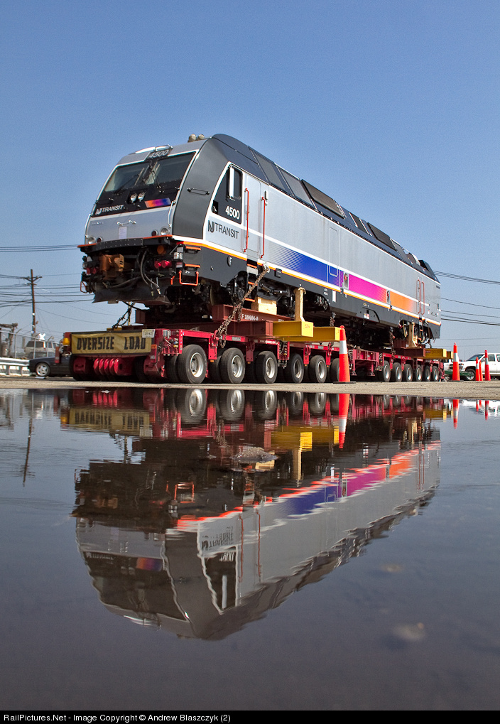 | NJT 4500 has yet to touch American rails as it sits on a trailer in Port Newark. The 4500 is the second of NJT's new dual mode locomotive to be delivered. NJT 4501 is currently in Pueblo, CO undergoing testing. Photo taken on private property with permission. |