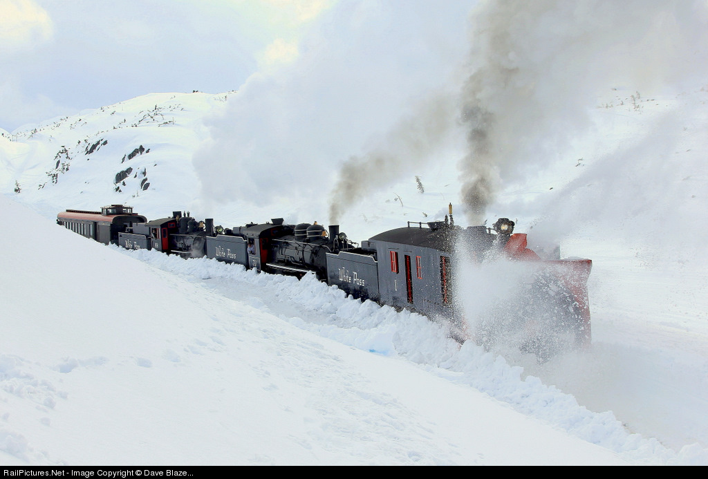 Snow Fleet - 1940s style! - In fact were it not for the "modern" #73 steam locomotive pushing this could be titled "1920s style." White Pass and Yukon Railway narrow gauge rotary plow #3 (Cooke 1899) is marching past the remnants of an old water tank here just a mile beyond the summit at White Pass (which also demarks the US-Canada border). This location is about 22 miles from Skagway and just a few feet below the summit elevation of 2865 ft. The vintage snow fighter is being pushed by steam locomotives #73 (Baldwin 2-8-2 blt. 5-47) and #69 (Baldwin 2-8-0 blt. 4-07) with coach 211 trailing. #211 was built by AC&F in 1918 for Oregon's Sumpter Valley coming to Alaska during WWII courtesy of the US Army. The cupola was added in 1946. The White Pass is America’s busiest tourist railroad and an engineering marvel of any era. Regular tourist trains operate for the four month cruise ship season of mid-May to mid-Sept with the WP&Y largely dormant the remaining 8 months of the year. In days of old it was a 110 mile freight hauler supporting the Yukon mining industry and before that a major WWII supply conduit during the building of the Alaska Hwy. Like the town it calls home, the WP&Y was born during the heady days of the 1898 Klondike Gold Rush and experienced booms and busts through the years but has persevered, and today is the most popular excursion for the hundreds of thousands of tourists who visit Alaska each summer.