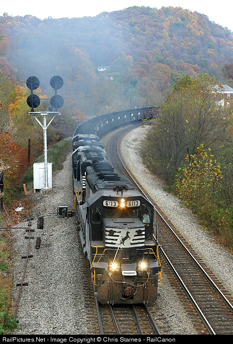 | An odd set of power for a coal train leads NS 83J eastbound at Falls Mills (SD40-2, GP50, B32-8). |