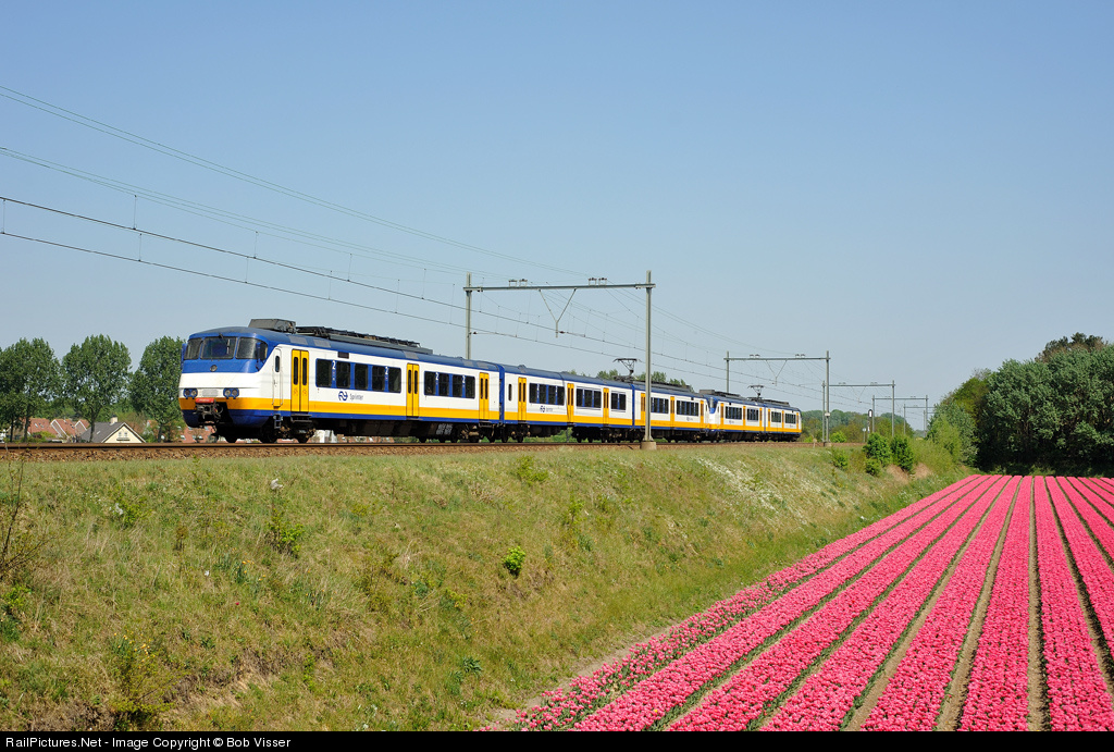 Every year in April and May the tulips bloom in the flowerfields between Haarlem and Leiden. NS 2966+2140 are underway from Haarlem to Den Haag.