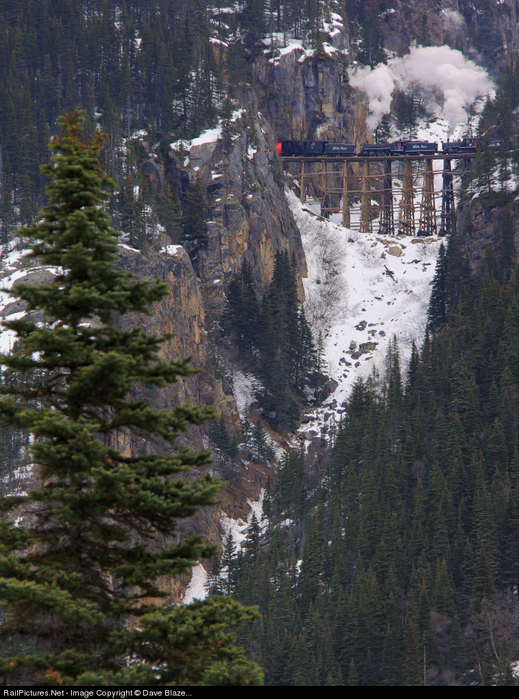 | Cliff Hanging! - The White Pass & Yukon's "rotary fleet" consisting of vintage snowplow #3 (Cooke - 1899) is marching upgrade trailed by twin steam locomotives #73 (Baldwin 2-8-2 blt. 5-47) and #69 (Baldwin 2-8-0 blt. 4-07) and coach 211 as it heads for White Pass summit and the Canadian border to do battle with the snow drifts in the time honored tradition. This is the task for which she was built 111 years ago. The train is traversing the high line and is just shy of 16 miles from Skagway and tidewater but has already climbed over 2000 feet. Here the train is curling over the curved wooden trestle of bridge 15C and into one of two tunnels on the line (250 ft long tunnel 15). This shot was taken from the platform of the following passenger train as we sat near MP 12.2 looking across the canyon of the Skaguay River which is some 1000 ft below the train clinging to the mountain side of the White Pass' "high line." |
