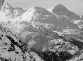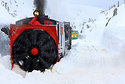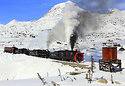 | Severe Clear! - What a day for plowing...After two hard days battling snow in a short four mile stretch of drifts in the deep cuts of White Pass Summit the rotary fleet has much better conditions on this third day as the make good time heading toward the water stop at Fraser. The White Pass & Yukon's "rotary fleet" consisted of vintage snowplow #3 (Cooke - 1899) trailed by twin steam locomotives #73 (Baldwin 2-8-2 blt. 5-47) and #69 (Baldwin 2-8-0 blt. 4-07) with coach 211 (blt. by AC&F in 1918 for Oregon's Sumpter Valley) bringing up the rear. The train is passing over a large fill at a location known as 23A on the railroad (for the former bridge located here). The tank in the foreground is not for water but rather was a fuel tank that the railroad used to fuel the Caterpillar dozers that supplanted the rotaries in the 1960s as the primary snow fighters on the pass. |