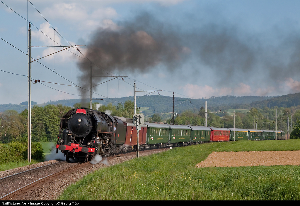 | Baldwin built "Mikado" 141 R 568 (former French Railways SNCF) with the "Swiss Classic Train" made two round trips from Winterthur through eastern part of Switzerland on may 1th. Locomotive and cars are owned by "William Cook Rail" of Andrew Cook from the UK. The train is tackling the 1.2 % grade from Stein am Rhein up to Etzwilen with full speed. |
