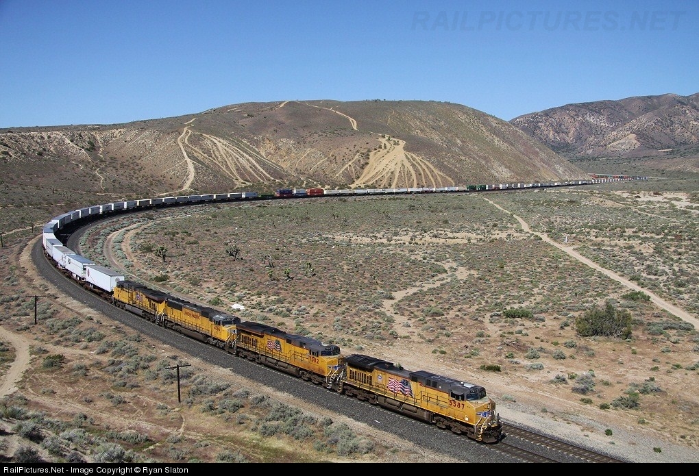 | The "Brooklyn", UP's hot shot Z from Portland to Los Angeles rolls down the eastern slope of the Tehachapi's near MP 375.7. The ZBRLC 28 will have a slightly longer day then normal as it has to detour through the Cajon Pass rather than take its normal route through Soledad Canyon. |