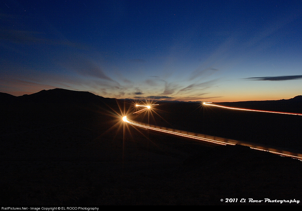 | Nighttime Meet at Lavic – As an eastbound double stack train winds it's way through the S turns at Lavic, the head end of a westbound pig train meets it at half way with the vehicle lights from Interstate 40 on the right. The change in direction of the eastbound bound train is what causes the flare at the apex of the S curve. |