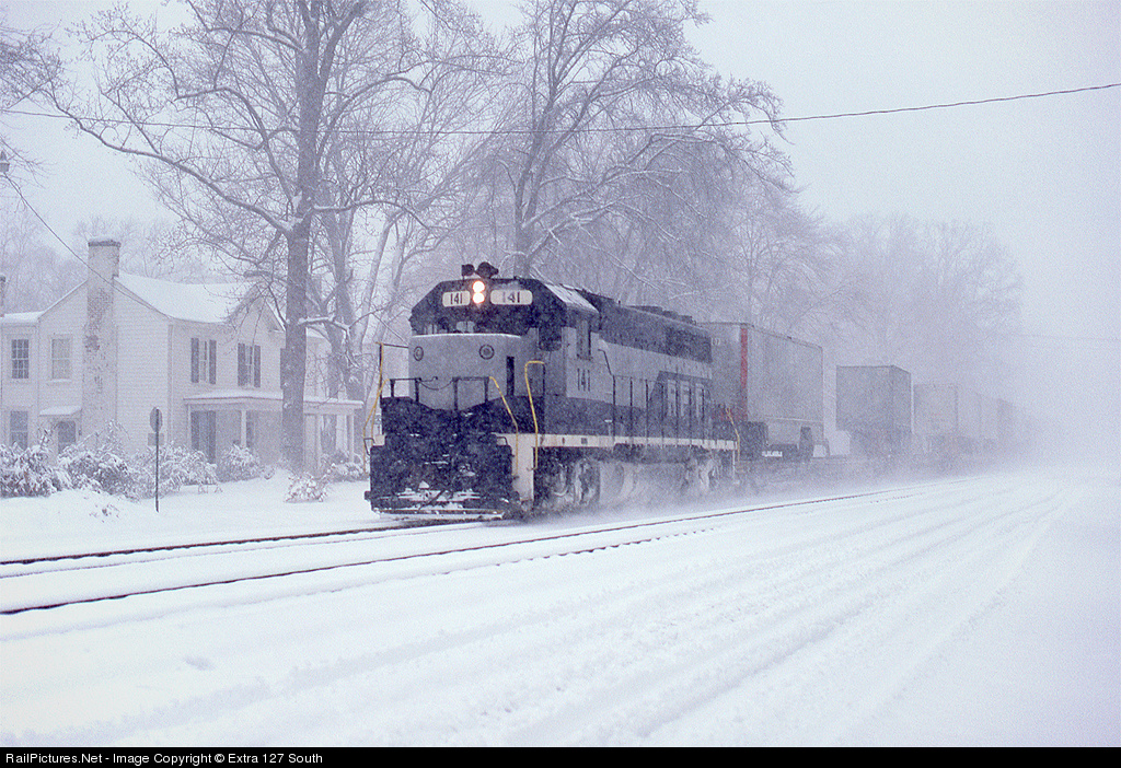 An extremely light TOFC hotshot No. 275 was rolling through Ashland, VA on a snowy Jan. 5, 1980. Beautiful homes, like the one to the left, line the RF&P through the town. No. 275 was light, not because of problems on the railroad, but because the storm had dumped so much snow in Northern Virginia, the truckers couldn't get the trailers to the ramp at Potomac Yard.