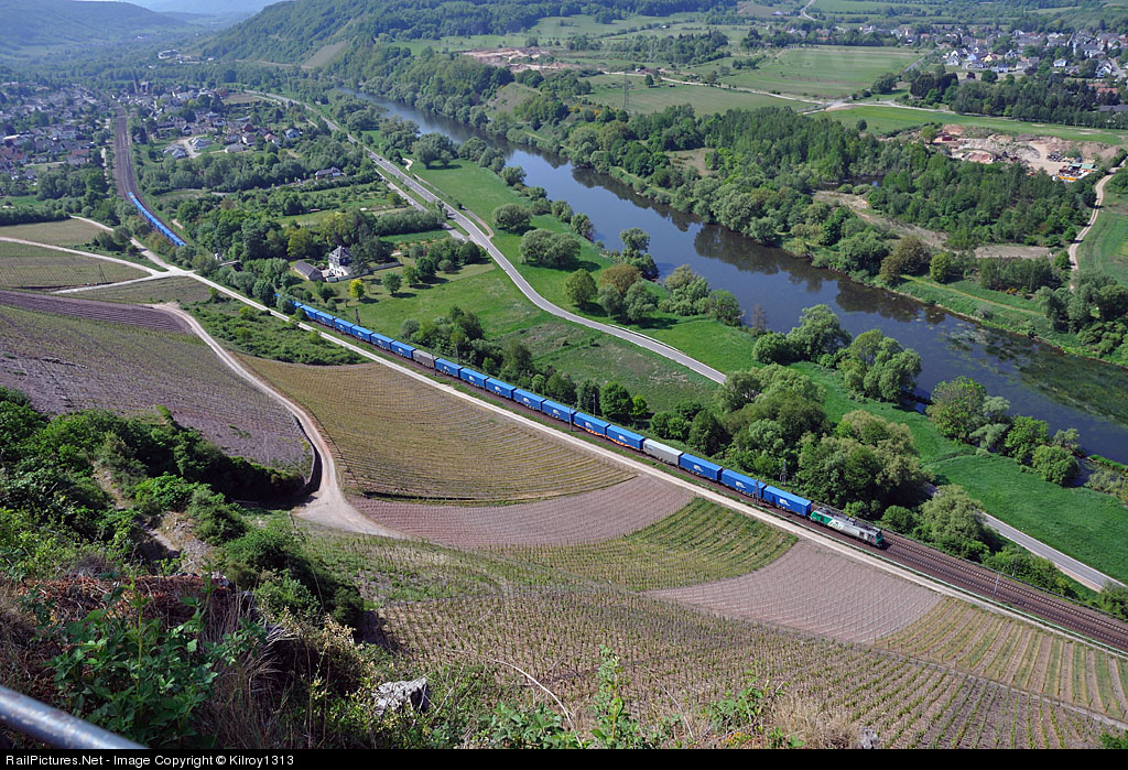 Unit train with french BB 37000 series electric loco passes Wiltingen towards Konz.