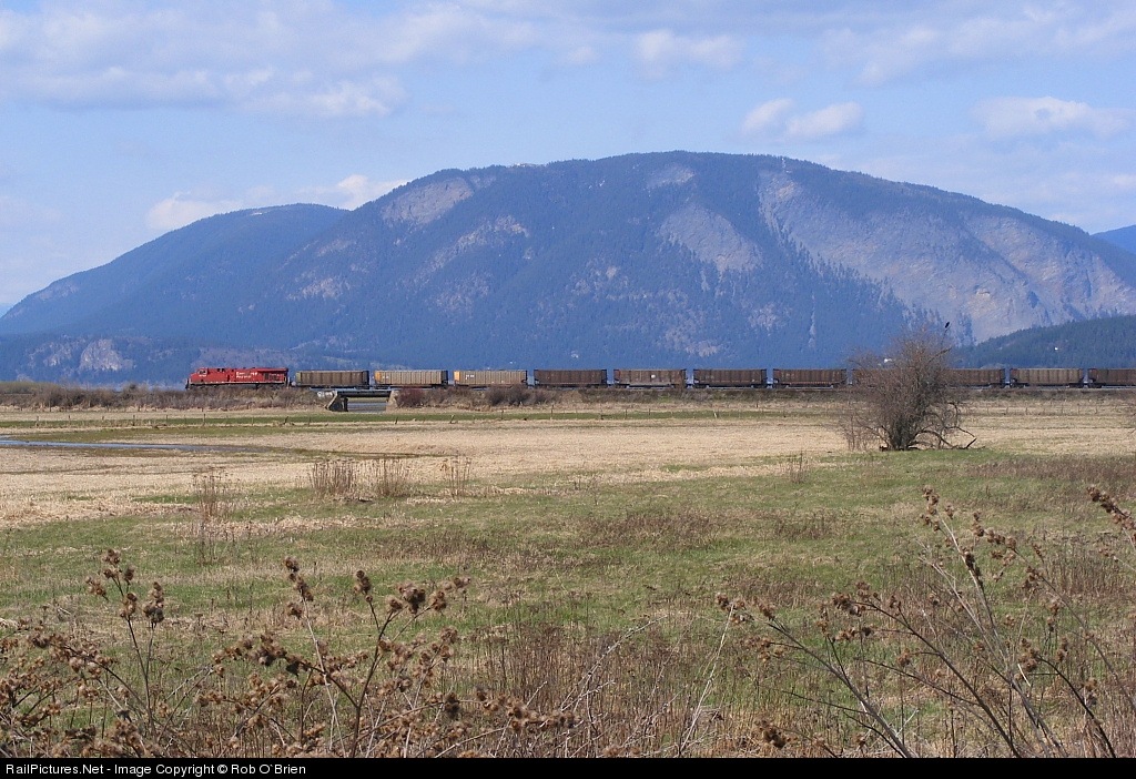 | A coal train crosses the Salmon River which leads into the Salmon Arm of the "H" shaped Shuswap Lake, Bastion Mountain in the background. The mid train DPU was 9782 of Unstoppable fame. |