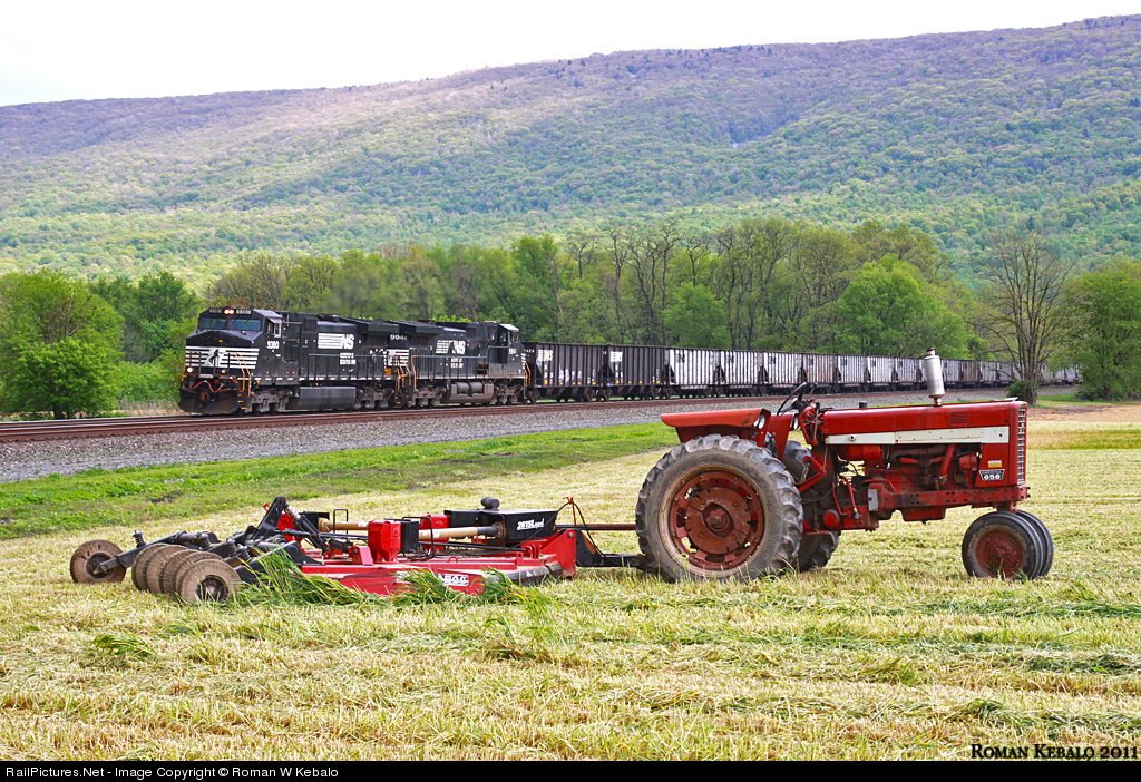 After cutting down an early field of straw, a FARMALL 656 tractor idles away as the ex-PRR Middle Division keeps moving...