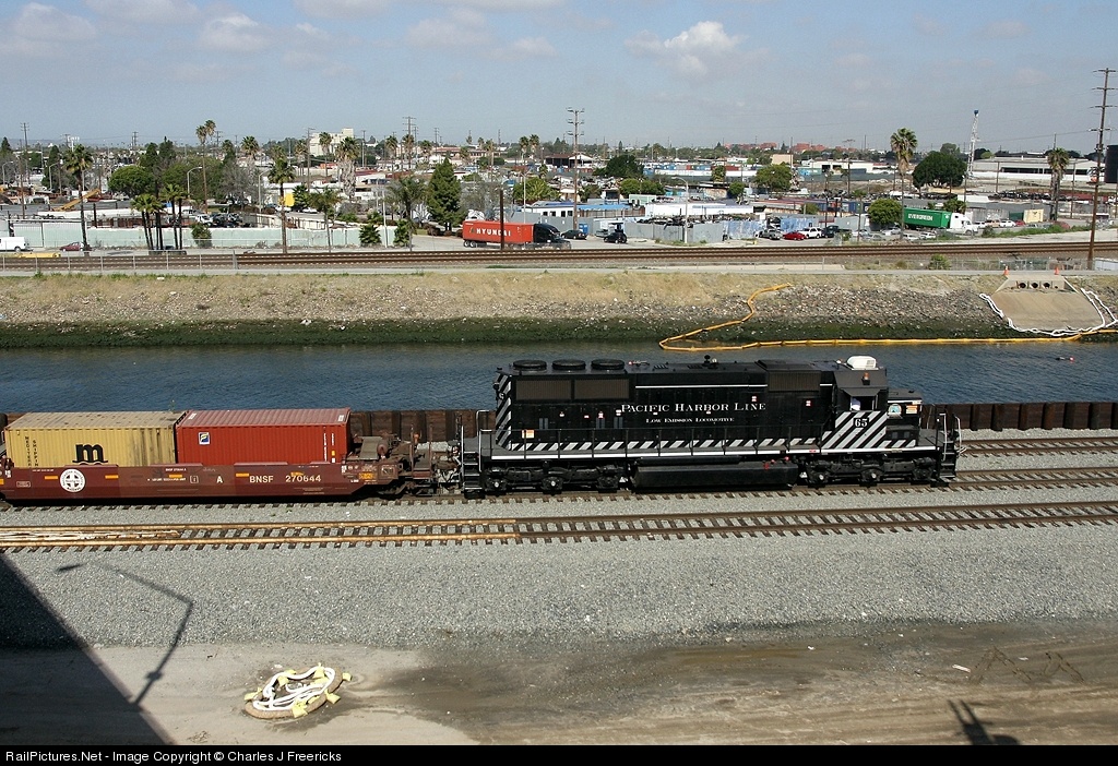 | One of the ubiquitous PHL dock jobs that run around San Pedro, Wilmington and Long Beach with their single locomotive shoving or pulling massive strings of tables with loaded containers, is seen here shoving along the Dominguez Channel on the Manuel Sub. The track across the river is the Alameda Corridor Sub. |