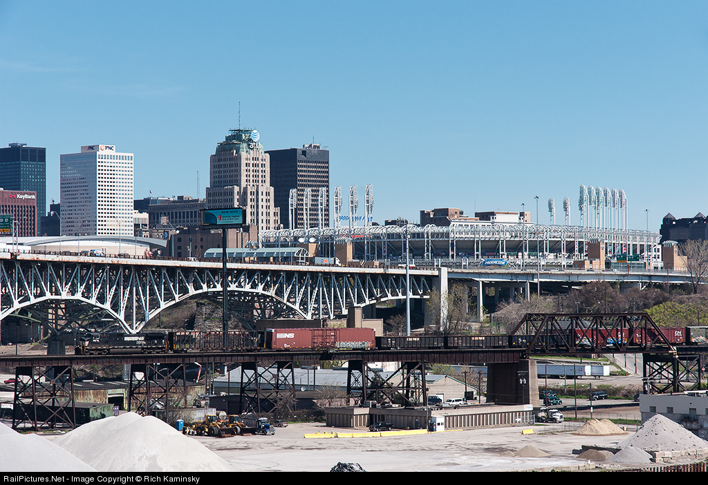 | NS 145 creeps slowly toward the malfunctioning drawbridge just ahead. In the background is Progressive Field, home of the Cleveland Indians, the winningest team to date this season in Major League Baseball's American League |