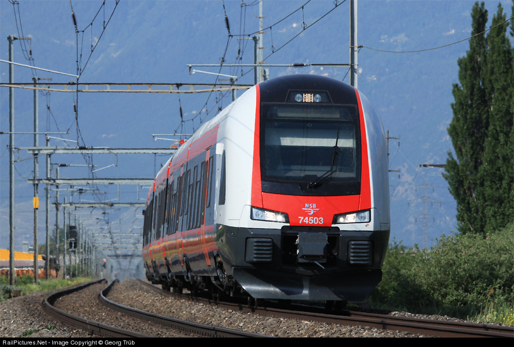 | The new "Flirt" BM 74 003 (this end car lettered 74 503) from StadlerRail for the norwegian NSB is tested with up to 124 miles per hour (200 km/h) on the straight tracks in the Valais between Martigny and Sion. |