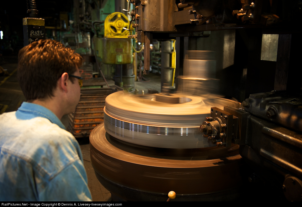 We are watching as steam locomotive specialist Jason machines a 2-8-0's main driver so that it is no longer out of round. Notice the shiny upper part of the rim; this signifies that about half has been properly finished. When in use on the locomotive itself, that main pin will be subjected to thousands of pounds of thrust. This type of work I find completely amazing. Here is a piece of cast steel, weighing hundreds of pounds, being shaped to the tolerances of a few thousandths of an inch by a huge machine and a tiny carbide tip. I feel so privileged as a steam fan for finally witnessing such precise machining with my own eyes. A close-up HERE.