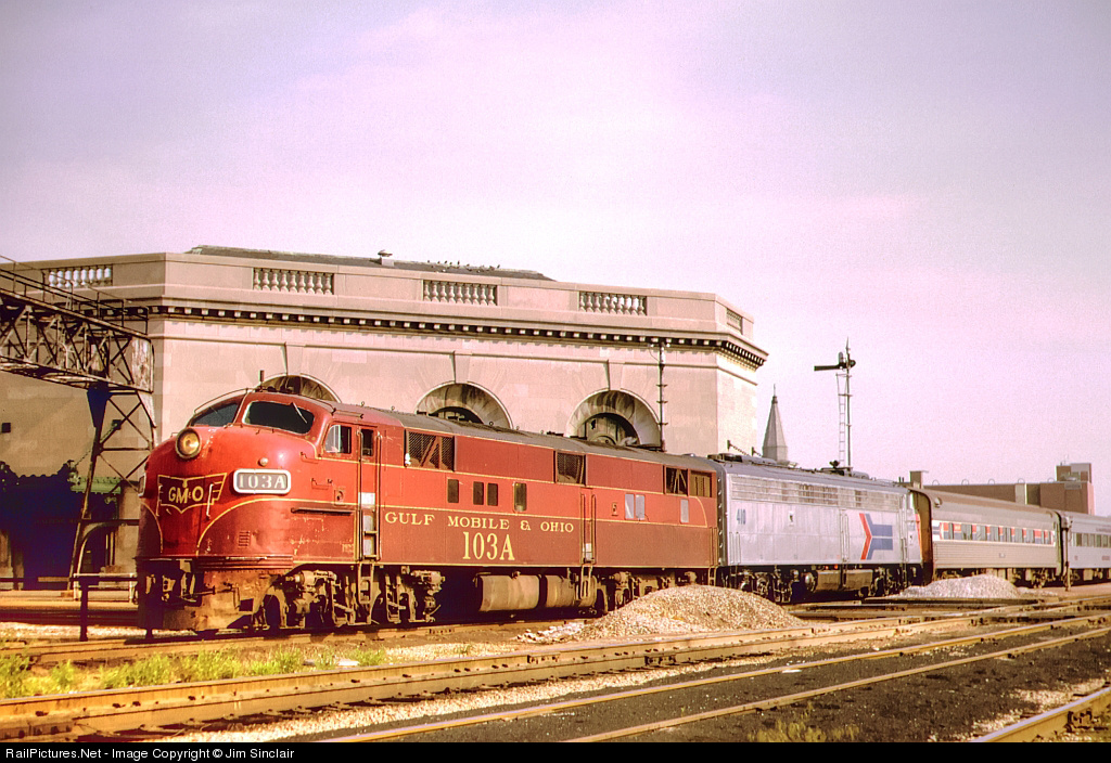 Inspired by Jeremy Plant's recent and awesome views at Joliet, I offer this view for RP.Net viewers. Built for the Chicago & Alton in March 1945, GM&O 103A is still sporting its original number and doing what God and EMD intended for it to do... pull passenger trains. Indeed, it was a real treat to see this elderly lady in charge of the southbound Prairie State on "home" rails and more than two years after the startup of Amtrak. Within a minute after I snapped this Kodachrome with my father's old Argus C3 camera, the train was off to St. Louis. And while the sight of this engine may have been "old-hat" to the locals along the route, this 17-year-old from Michigan was delighted to see and photograph his first GM&O locomotive!
