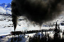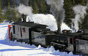 | Heading for the Hills - The White Pass & Yukon's "rotary fleet" consisting of vintage snowplow #3 (Cooke - 1899) blasts out of town trailed by twin steam locomotives #73 (Baldwin 2-8-2 blt. 5-47) and #69 (Baldwin 2-8-0 blt. 4-07) and coach 211 as it heads for White Pass summit and the Canadian border to do battle with the snow drifts in the time honored tradition. This is the task for which she was built 111 years ago. She is on the mainline while the track in the foreground leads to the north end of the WP&Y shop and yards |