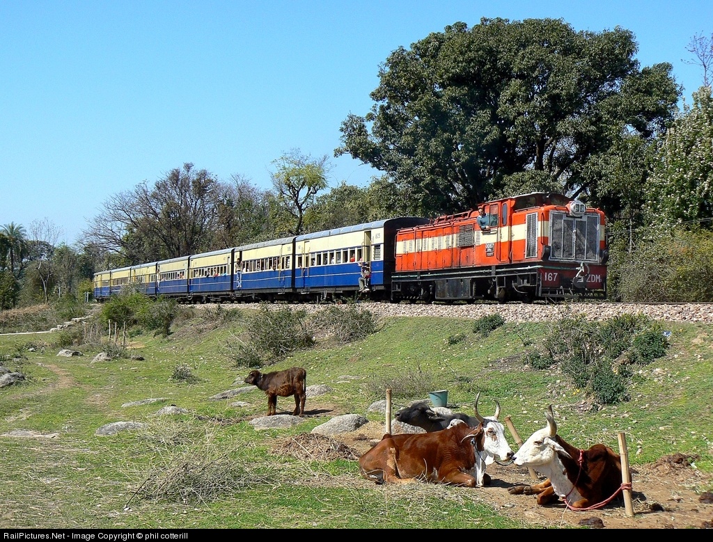 | Kangra Valley Railway ZDM3 No 167 heads the 0700 Pathankot to Baijnath Paprola, seen nearing Nagrota. The cows have seen it all before. |