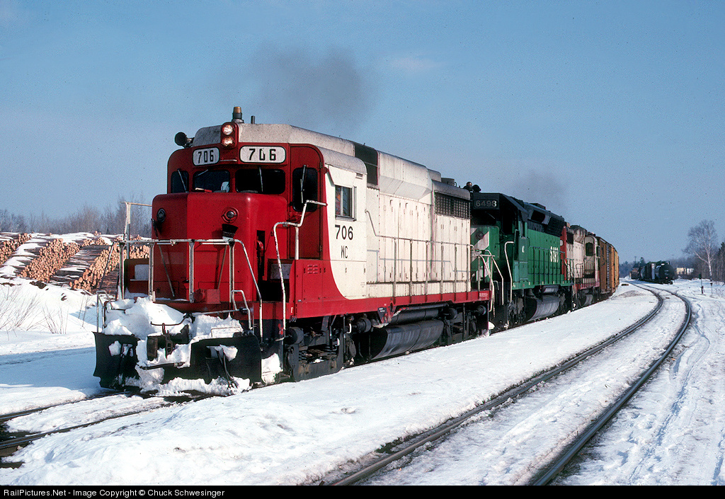 | On a cold bright Feb. afternoon WC train LO-41 works the yard at Trout Lake. The WC was struggling through its first winter and power assignments were somewhat scrambled up. The two ex Soo GP30's 706 and 715 are spliced by ex BN SD45 6498. The Ex DSS&A line from Trout Lake west to Marquette was normally four axle territory but with WC power short and the ground frozen like rock it was decided that the SD could safely work the 80lbs jointed rail to Marquette although the crew was instructed NOT to used the SD on any side or industry track. So every stop required one of the 30's to be cut off to work the sidings or enough cars had to be kept with the power to keep the SD on the "main". |