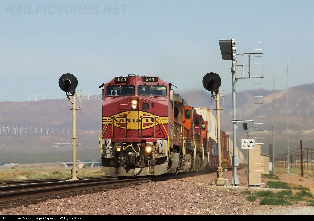 | The old heart of the Santa Fe still beats on the Mojave Sub as BNSF 641 (ex Santa Fe 641) passes a pair of old target signals at the west end of Sanborn siding. Sadly the old targets will meet their maker in the coming weeks, their replacements stand quietly near by. |