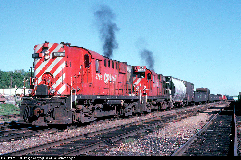 CP 8798 leads a rebuilt sister and train 911 at Sault Ste. Marie. The units puff some trademark Alco smoke as they make their way through the yard.