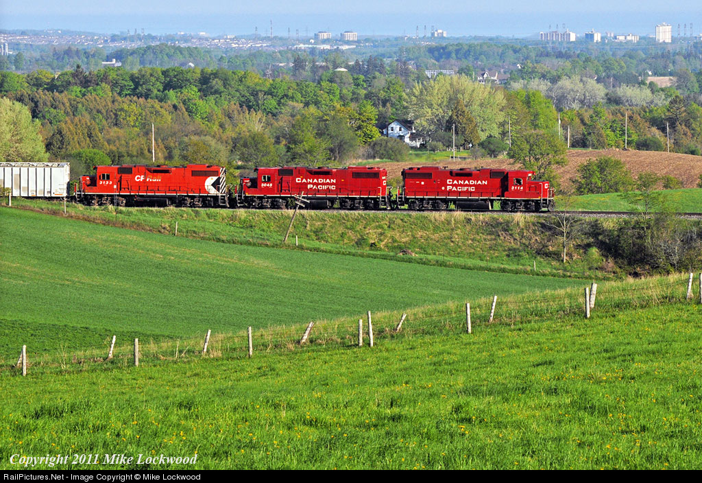 Rolling along the top of the Oak Ridges moraine, Havelock crews get a commanding view of the countryside as it slopes down towards Oshawa and Lake Ontario. CP 3114, 3045, and 3133 are westbound is nice sun with T07's train at Raglan, Ontario. 1843hrs.