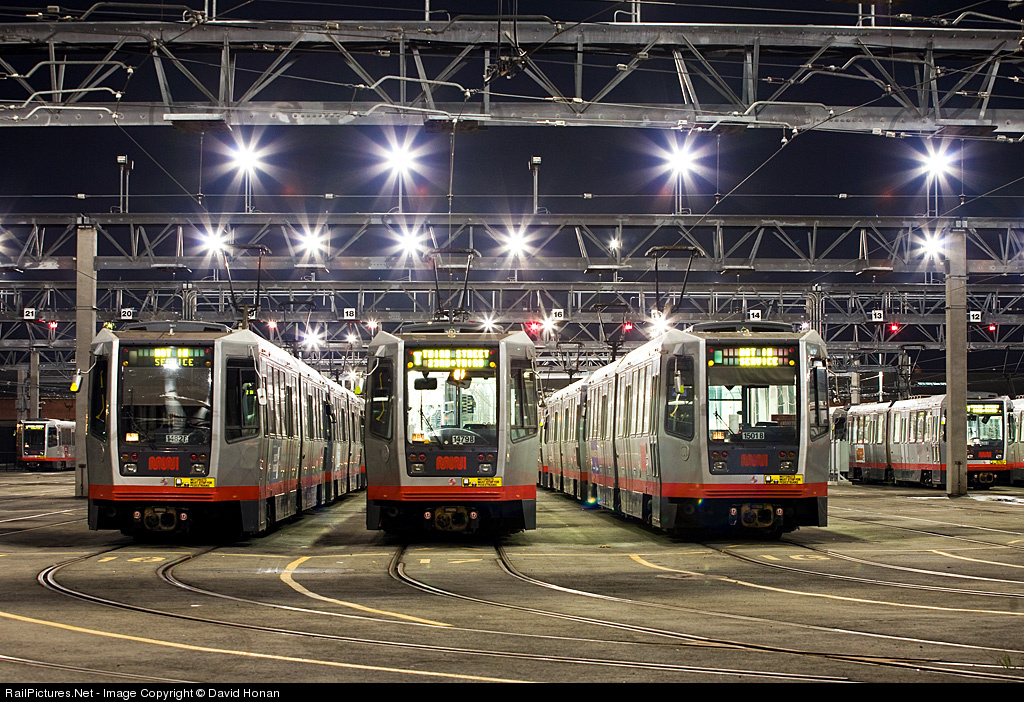 Dozens of LRVs are parked for the night inside Muni's sprawling Metro East Maintenance Facility.