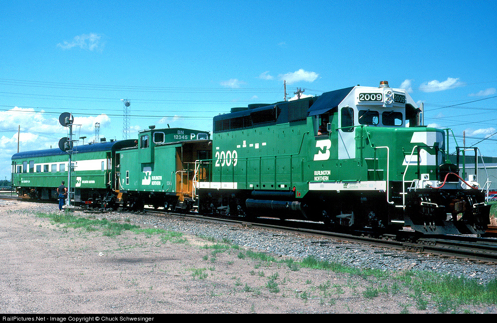 | BN GP20C 2009 powers a track geometry train eastbound at North La Crosse. The ten GP20C rebuilds didn't last very long in BN service coming in 1988-90 with the first one leaving due to wreck damage in 1991 and the rest being sold in April 1993. |