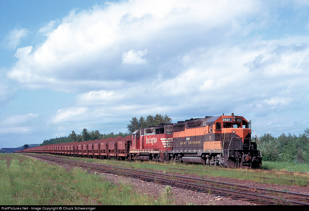 | BN GP35's 2520 and 2524 at Kelly Lake with ore loads. Photo not taken by me, but is part of my collection. No photographer information on slide. |