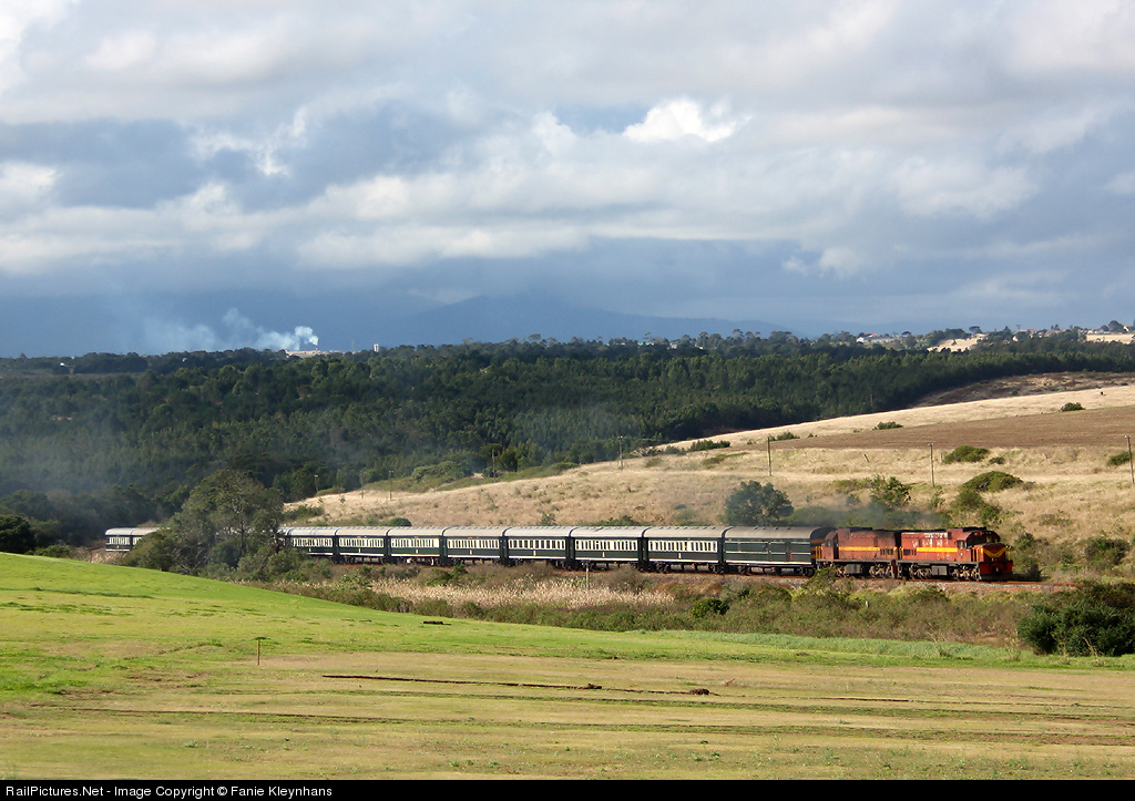 | Two class 33's are working hard up the grade with a Rovos Rail train, having just left the town of George in the distance behind the trees, currently on a 9 day trip from Pretoria to Cape Town. |