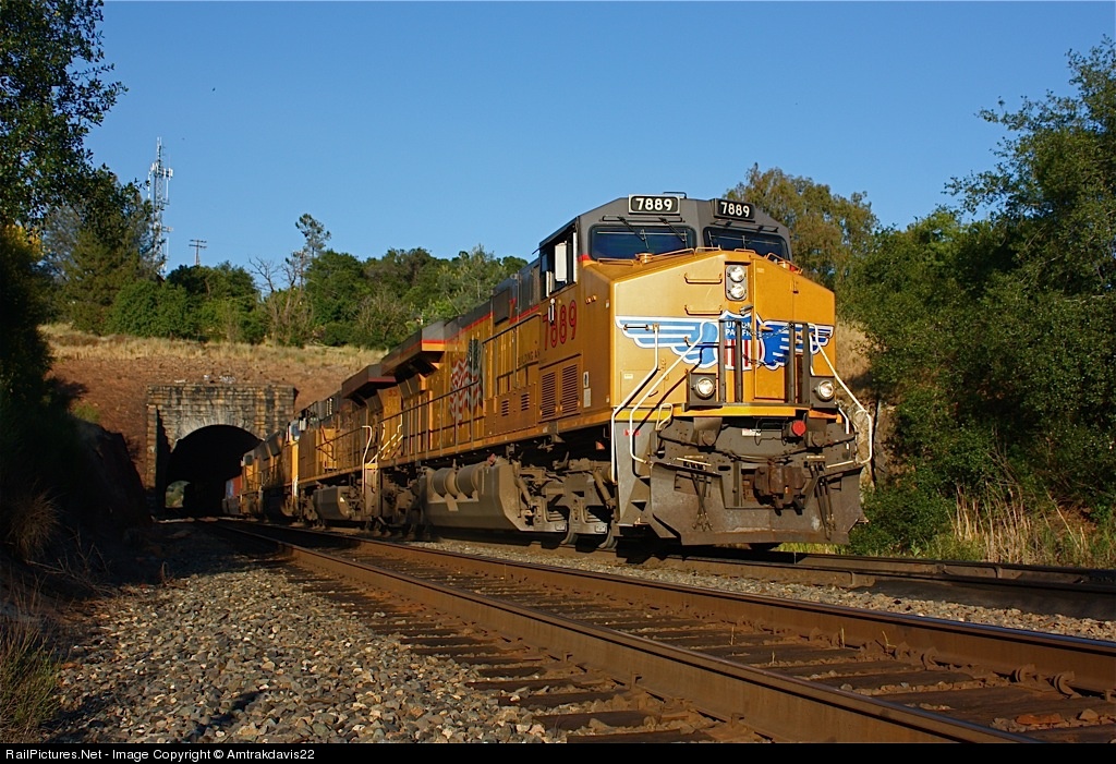 | Union Pacific 7889 and three other units scream as they slowly bring this long intermodal train down maintrack 1 of the Roseville Sub. Maintrack 1 was originally built buy the Central Pacific railroad on the first line over Donner Pass. Maintrack 2 is seen here at one of the only points in the foothills where both tracks are together, Newcastle (Tunnel 18). |
