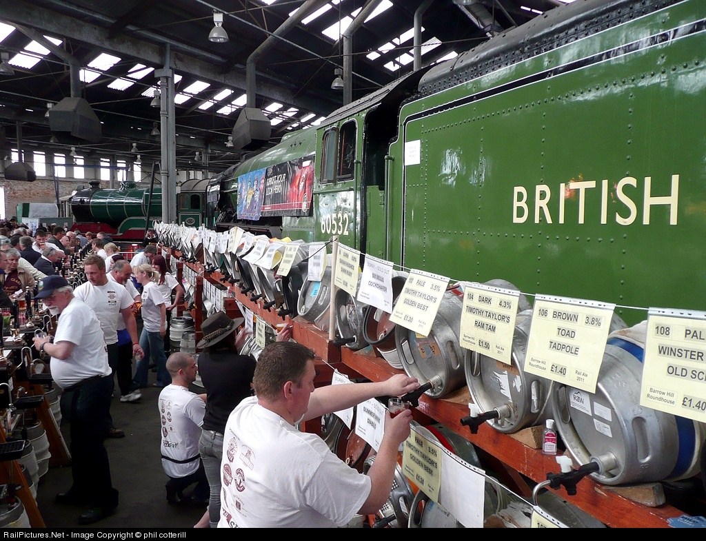 | Cheers! Barrow hill Roundhouse museum has held an an annual beer festival for the past 10 years. This year, there were over 150 real ales available as well as steam train rides. A really atmospheric place to enjoy a beer! 60532 "Blue Peter" provides a nice backdrop to the beer barrels. |