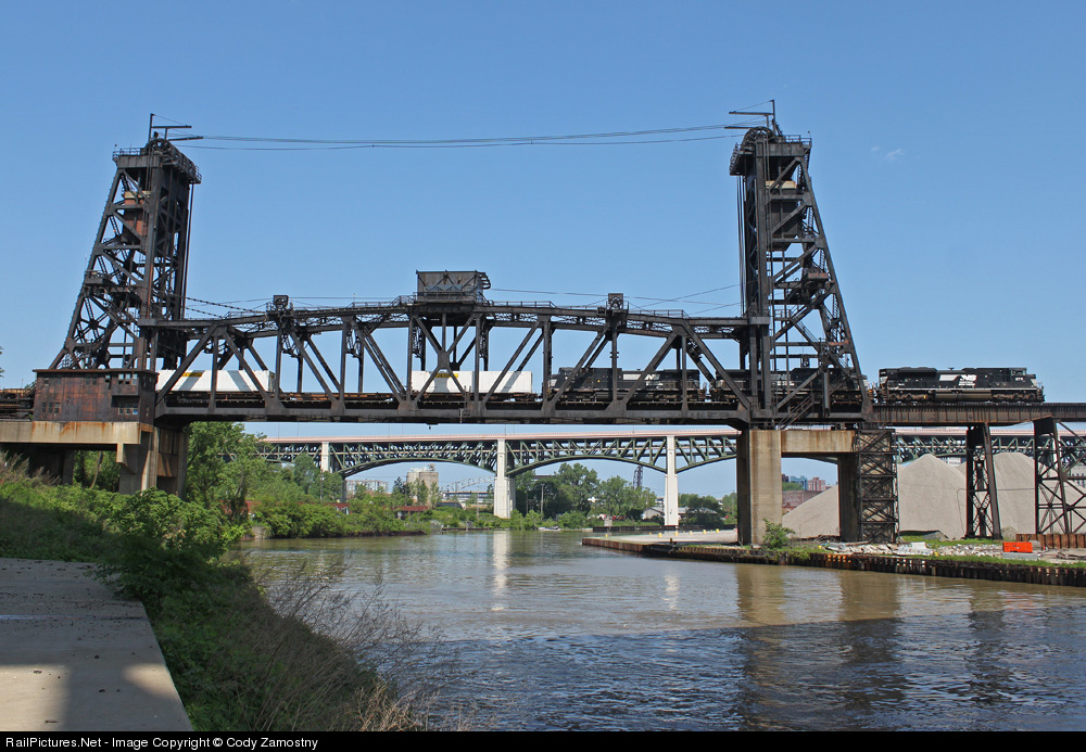 | After waiting momentarily for a cargo ship to clear, intermodal train 22K proceeds across the drawbridge spanning the Cuyahoga River. With this bridge begins the NKP viaduct across The Flats of Cleveland. |