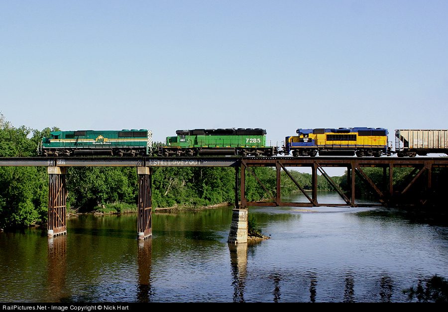 | Illinois Railway's Job 107 heads east across the Fox River, passing through Sheridan, on its way to the BNSF's Eola Yard. |