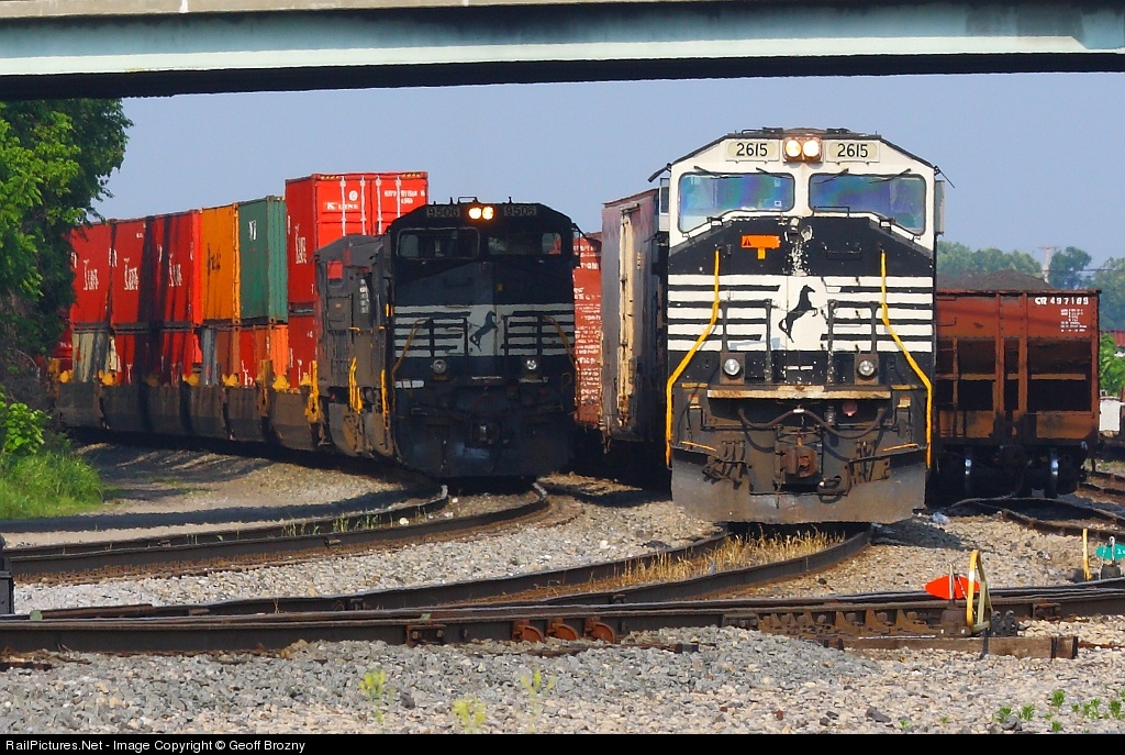 | Sitting around with nowhere to go due to a crew shortage, the NS 233 sits in the shade under the Harmon St overpass, while the NS 17M sits out in the sun. Both trains finally would get moving about an hour later, to be delayed in Columbus due to signal and switch problems due to a bad thunderstorm. |