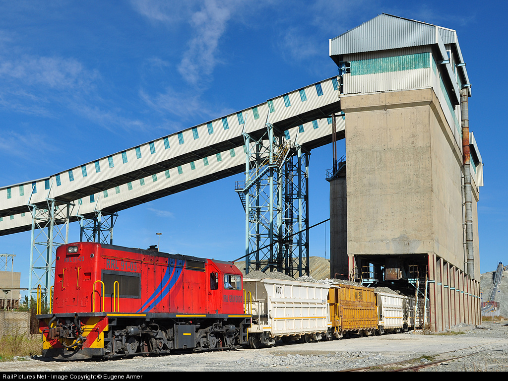 Former SAR/Spoornet/Transnet Freight Rail class 91, now operated by RRL Grindrod as their 91-03, departs Harmony Gold's Nyala Shaft with a full load of ore hoppers. The train will run over mine trackage and Transnet Freight Rail trackage, before the load is handed over to one of Harmony Gold's own locomotives for the final leg to the processing plant. These loco's were built for the 610mm (2'0") gauge and now run on 1067mm (3'6").