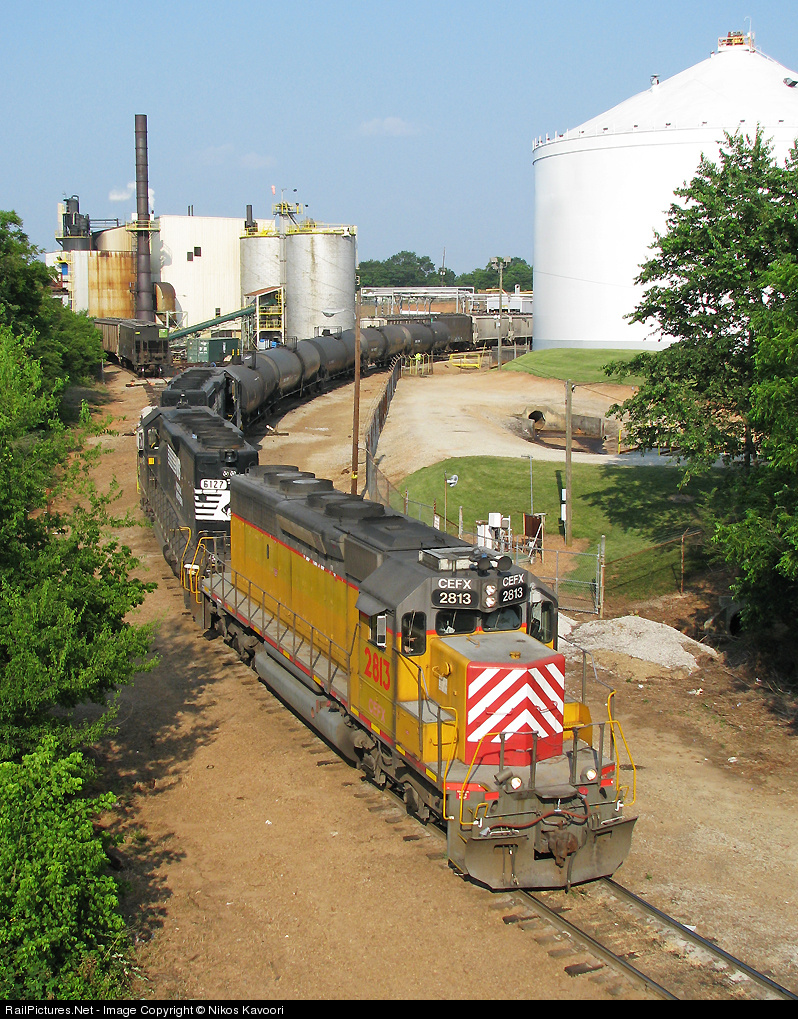| After getting my shots of P37 with the CITX 2788 I headed back to Gainesville to get some shots of the CEFX 2813 also in the Red nose scheme switching the Cargill Soybean plant, the steep grade into the plant necessitates the use of three units. Was neat standing on the bridge and seeing two trains with matching leasers. |