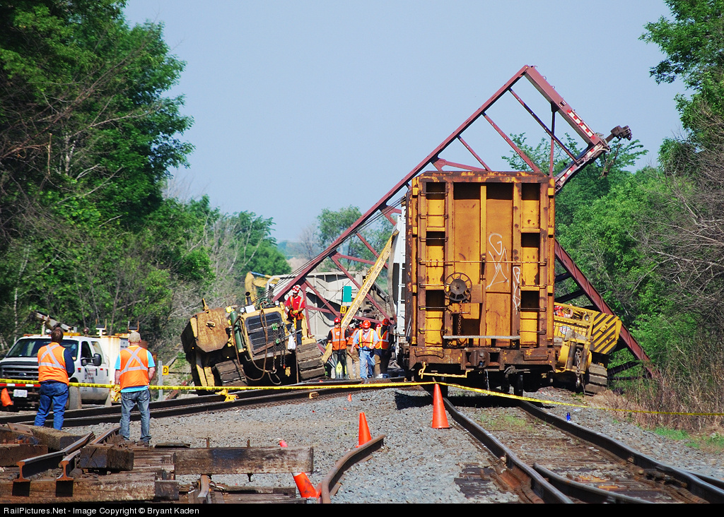 | Around 3 pm on June 6, 8 cars of westbound train 293 derailed at the bridge over the North Fork of the Crow River just west of downtown Paynesville. There were no injuries and no hazardous materials were involved. The next morning finds cleanup crews hard at work, but with a long way to go. |