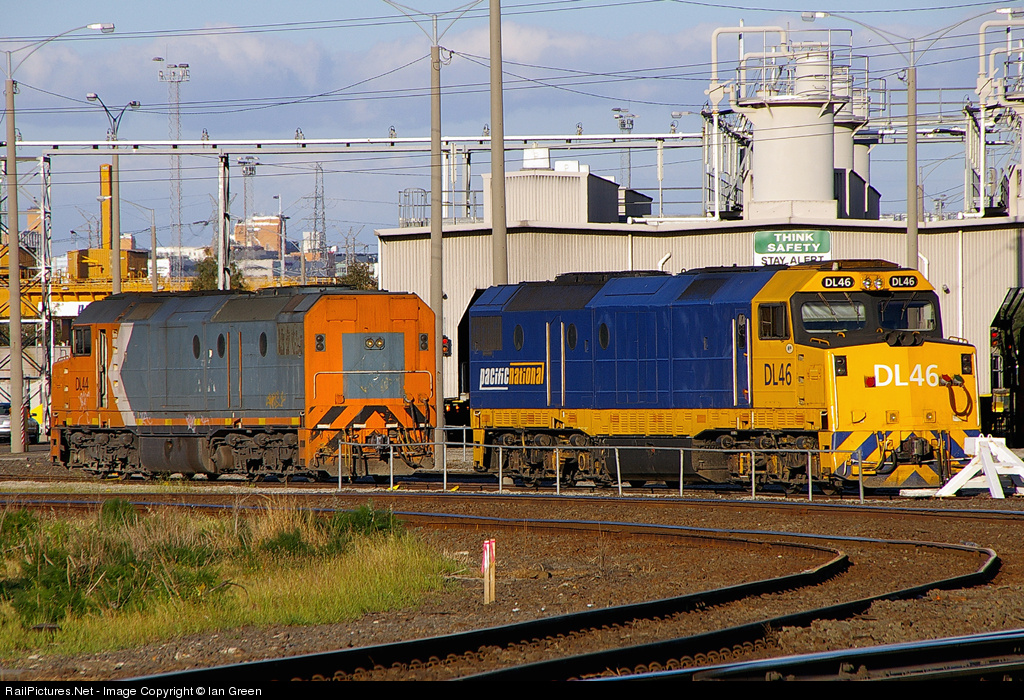 DL46 in the new Pacific National livery and DL44 in faded National Rail livery share the loco provisioning centre near Sims Street Junction.