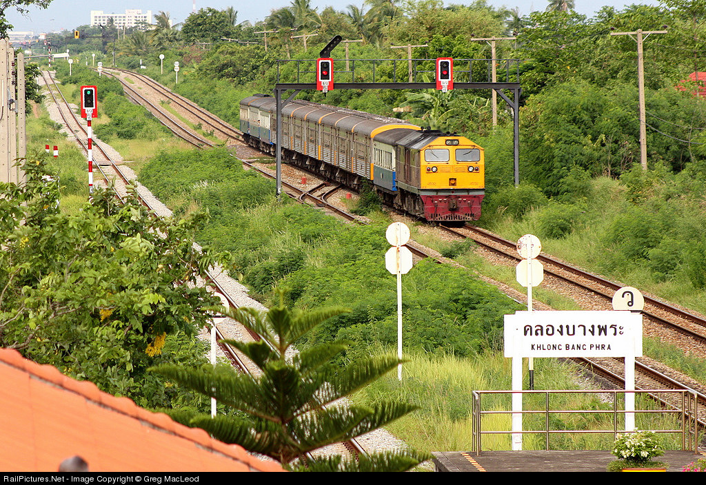 A local train from Chachoengsao heads down the triple track mainline toward Bangkok. Downtown Chachoengsao can be seen in the distance