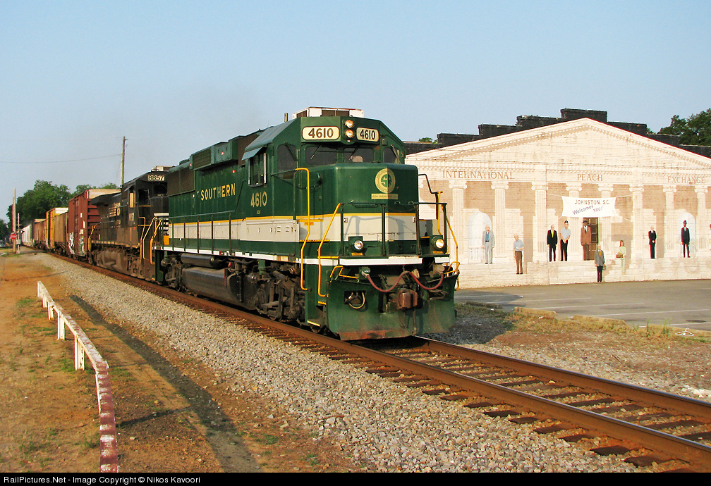 | NS 156 with the NS 4610 rolls past the elaborate International Peach Exchange mural in Johnston, SC. This is peach country with acres of Peach groves lining the R line as it passes through the countryside. |