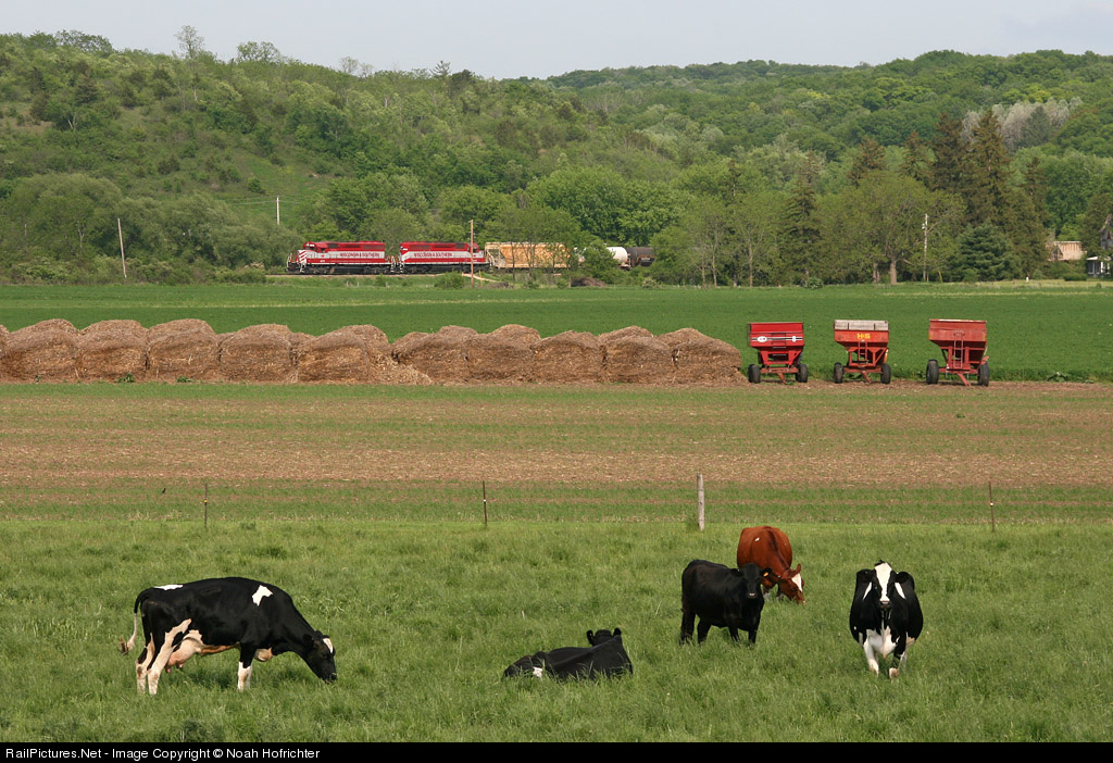 | WSOR 4076 and 4010 tip toe along the edge of a pasture near Cross Plains, WI, as some cows go about their usual business and some farm equipment waits for harvest season. |