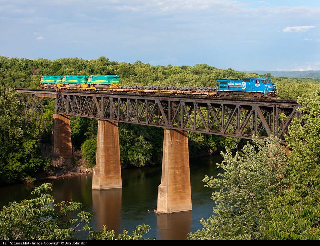 | Conrail leader with a VALE locomotive export move crosses the Potomac River from Maryland into West Virginia. The 3 brand new export locomotives are bound for Brazil via Norfolk, VA. |