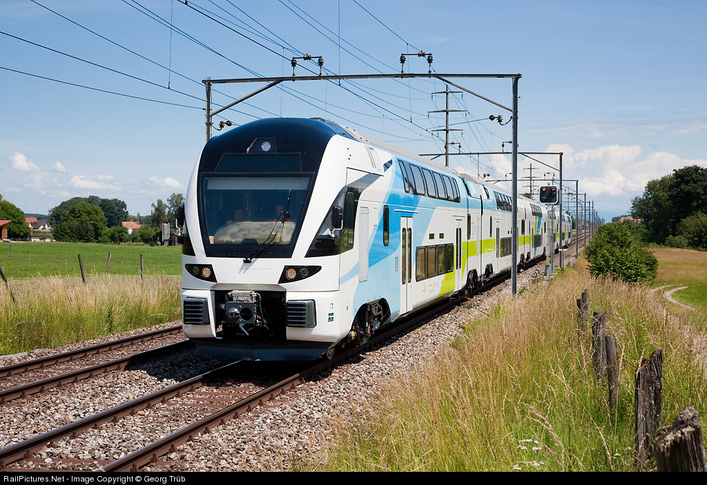 | Brandnew doubledeck Intercity train from StadlerRail for the "Westbahn" (Austria) on a test run. The six car train is similar to the RABe 511 for the SBB, but capable for 125 miles per hour (200 km/h). Seven of this trainsets will run between Vienna and Salzburg from december 2011. |