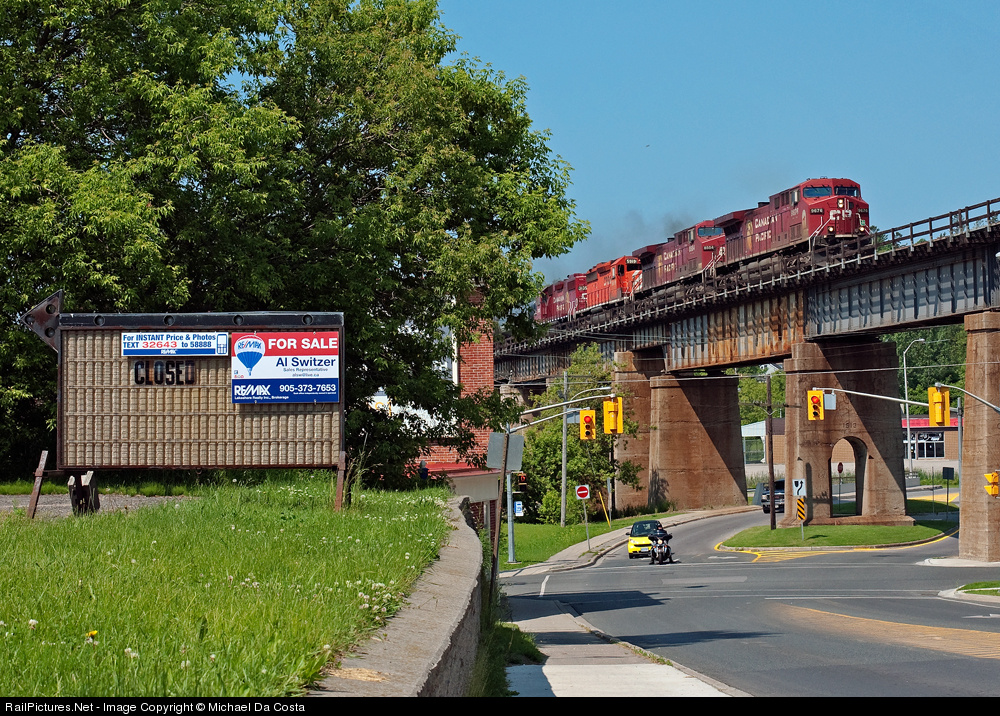 | The quiet town of Port Hope plays host to two main railways in Canada, Canadian National and Canadian Pacific, here we see one of the two roads in action as a pair of AC4400's lead an SD40-2 and a GP38-2 eastbound with a lengthy freight to Montreal. |