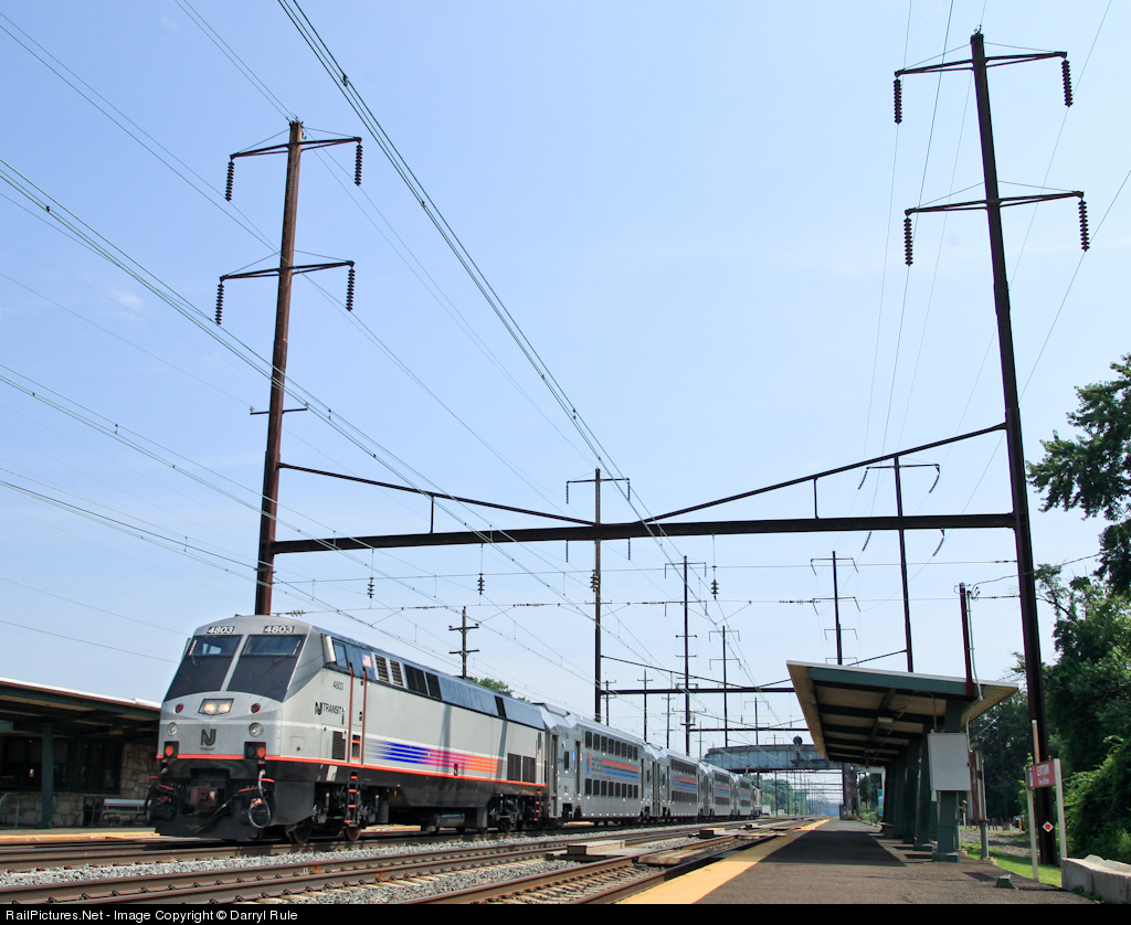| After taking the winter off, the ACES are back in service for the summer and fall. Here we catch NJT 4803 roaring through Levittown, PA. Recent track work required the removal of the fence between the 2 center tracks allowing Southbound trains to be shot from the Northbound platform unobstructed. |