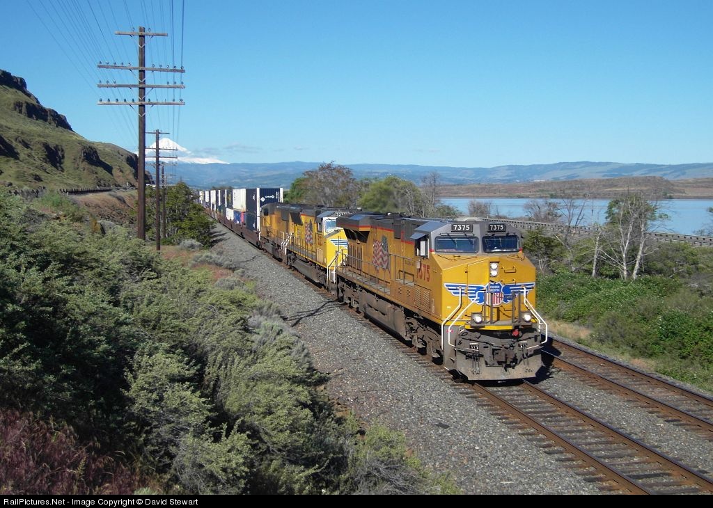 | Another east bound Union Pacific domestic intermodal train races through the Columbia River Gorge east of Hood River Or. The year round snow capped Mount Hood appears in the distance with the Columbia River to the right. |