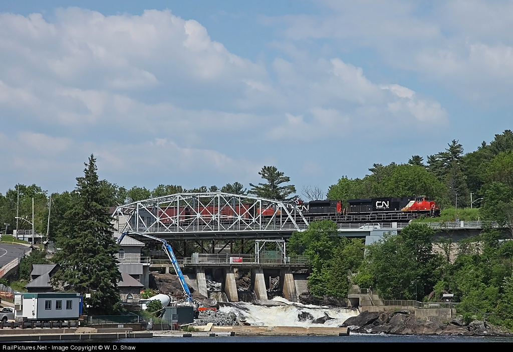 | CN 450 with "ES44DCm " 2263 leading crosses over Bracebridge Falls as work continues on the power stations below. 2263 has been modified with emissions testing equipment; note the new section with the raised top in the center of the long hood. |