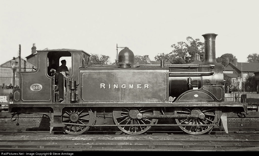 | It has taken no less than 106 years for this wonderful portrait of a London, Brighton & South Coast Railway 'D1' class to emerge from obscurity. It is from a small but fascinating collection of original images in my archive taken by the delightfully named Wentworth S. Gray. 125 of these elegant Victorian tank locomotives were designed by William Stroudley and built at Brighton between 1873 and 1887. All were named after towns and villages served by the line, Ringmer being near Lewes in East Sussex. Stroudley's gloriously imaginative livery was a rich mustard yellow, the so-called 'improved engine green'. Sadly this was abandoned (and the names removed) in favour of a more sombre umber before World War 1. The commodious 'pagoda-roof' cab and the superbly proportioned, copper-capped chimney that so enhanced the appearance of these locomotives are an absolute joy to behold. Ringmer was built in November 1881 and was withdrawn in July 1925. Several D1s gave an incredible 75 years service, the last survivor not being withdrawn until 1950. |